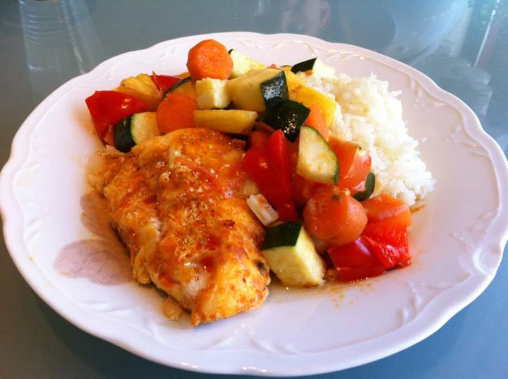 Fiskurinn settur í eldfastmót og grænmetið yfir ….og sett inn í heitan ofn….ég elda ekki fisk lengi….og þessi var í rúmar 20min.