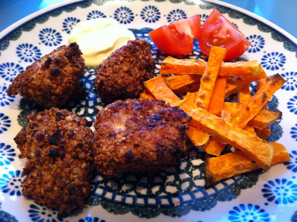 Síðan setja kjúklingabitana fyrst í mjölblönduna síðan í eggjahvítuna og að lokum í fitness blönduna.