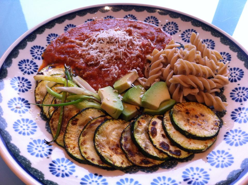 Smá vorlaukur og niðurskorið Avacado sem er æði með kjötsósunni