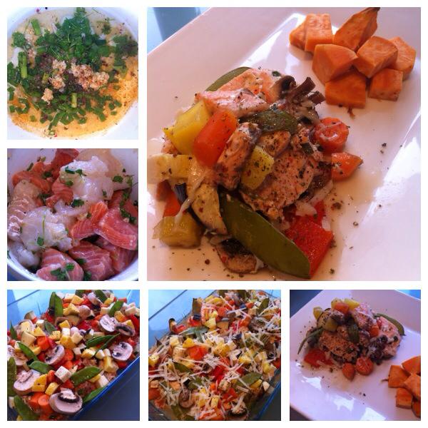 Leggja fiskinn í eldfast fat og skera allt grænmetið ofan á