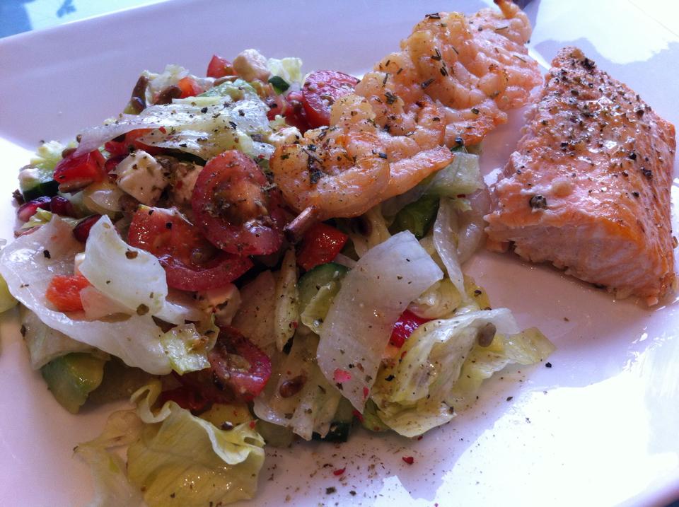 Svo kvöldmaturinn var Salat , Lax og Rækjuspjót frá Hafinu