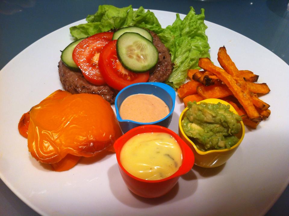 Í leiðinni skar ég niður gula papriku sem ég nota sem „hamborgarabrauð“ og baka hana í ofni.