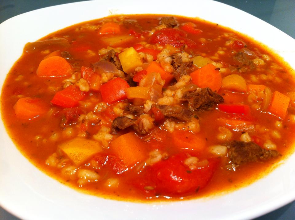 4. Bætið gulrótum,rófu, papriku,bankabyggi og tómötum í dós út í pottinn og látið sjóða við vægan hita í 30 min.